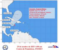 A las seis de la mañana de hoy, la región central de la tormenta tropical Melissa se localizó en los 16.3 grados de latitud Norte y los 75.0 grados de longitud Oeste, posición que la sitúa a unos 270 kilómetros al sudeste de Kingston, Jamaica. Se mueve lentamente, con un rumbo próximo al noroeste y una velocidad de traslación de seis kilómetros por hora.