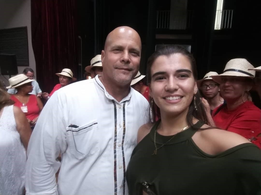 La joven Adriana Artiles Bravo junto al Héroe de la República de Cuba Gerardo Hernández Nordelo, coordinador nacional de los CDR. Foto: Cortesía de la entrevistada