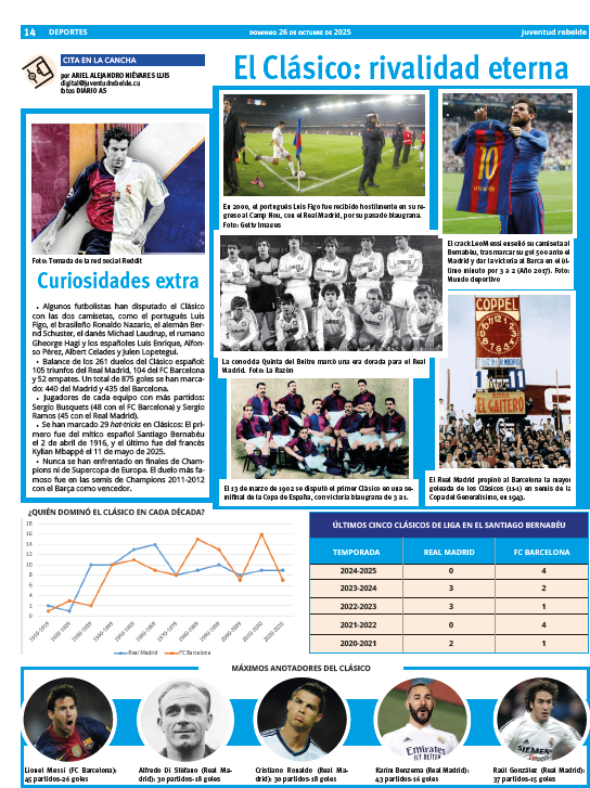 - Se han marcado 29 hat-tricks en Clásicos: El primero fue del mítico español Santiago Bernabéu el 2 de abril de 1916, y el último fue del francés Kylian Mbappé el 11 de mayo de 2025.