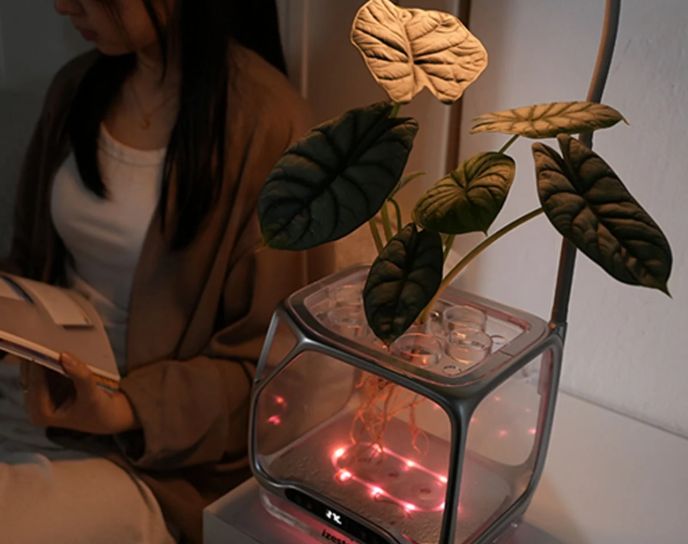 Diseñado por Yunyi Zheng, el Izestee es probablemente la maceta más avanzada del mundo. El cubo transparente permite ver claramente las raíces de la planta, que están suspendidas en el aire, sin tierra ni agua, solo columnas de niebla nutritiva pulverizada desde la parte inferior del dispositivo.