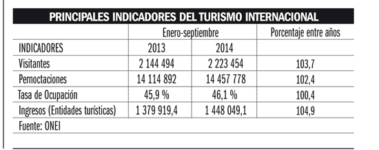 Los resultados preliminares del período están contenidos en la publicación Turismo internacional. Indicadores seleccionados. Enero-Septiembre de 2014, elaborada por los especialistas del Centro de Gestión de la Información Económica, Social y Medioambiental de la Oficina Nacional de Estadística e Información (ONEI), disponible en www.onei.cu.