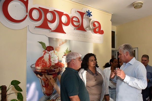 Díaz-Canel conversó sobre la composición del helado Coppelia, ese que se hacía cuando Celia daba seguimiento a una fábrica concebida para satisfacer uno de los gustos más acentuados del cubano. ¿Si volviésemos a hacer ese tipo de helado estaríamos muy alejados de los mejores que hay en el mundo?, preguntó, a lo que Chelenin Darias Jorge, director general del Complejo Lácteo de La Habana, respondió con un no rotundo, en franco tono de que sí podemos hacer, como en otros tiempos, muy buenas cosas.