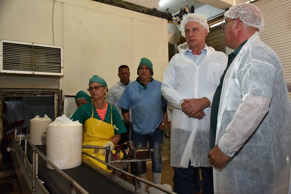Numerosas preguntas y reflexiones hizo el Jefe de Estado en la UEB donde se elaboran helados Coppelia y Varadero. «Esta fábrica tiene que volver a ser como la fundó Fidel», expresó el mandatario en un intercambio, donde también estaban Luis Antonio Torres Iríbar, primer secretario del Partido en La Habana; Reinaldo García Zapata, Presidente de la Asamblea Provincial del Poder Popular en la capital; Iris Quiñones Rojas y Alejandro Gil Fernández; titulares de la Industria Alimentaria, y de Economía y Planificación, respectivamente.