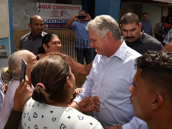 Visitando a vecinos en sus casas, conversando con quienes pasan sus horas rehaciendo lo roto, avanzó el mandatario. El pueblo dio vivas a la Revolución, a Fidel, a Raúl, a Díaz-Canel. Una señora exclamó: «Míralo ahí», y una muchacha que se quedó atrás se puso a comentar que el Presidente camina muy rápido, tanto, que no es fácil seguirle el paso.