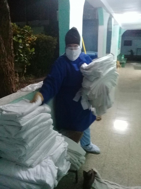 Me entristeció ver que al pasar de los días clareaban en ellas los manchones causados por el uso intensivo del cloro. No los notábamos de inmediato, como tampoco notaríamos si el virus se adhirió alguna vez en su densa tela mientras limpiábamos los cuartos, pasillos y escaleras, o cuando recogíamos sábanas y toallas usadas por las 16 personas que entraron como contactos y unos días después salieron con un PCR confirmatorio, en altísima proporción para los 70 huéspedes que conocí.