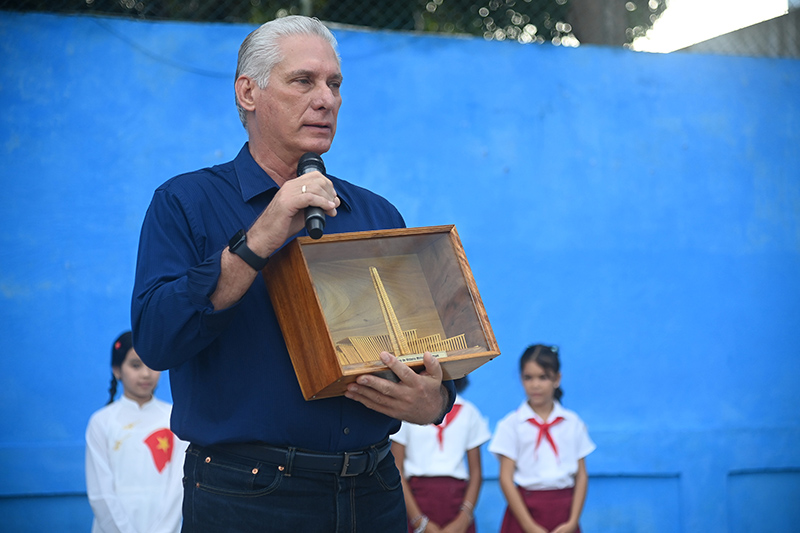 Luego de explicar la razón por la cual estaba en el centro cuya matrícula es de 604 alumnos que cursan desde prescolar hasta el sexto grado, Díaz-Canel Bermúdez ofreció una detallada explicación sobre los objetos con los cuales había llegado: “Este primero -enunció- es la maqueta del Museo de Historia Militar de Vietnam, que lo visitamos el primer día. Llegando casi a Vietnam lo visitamos”.