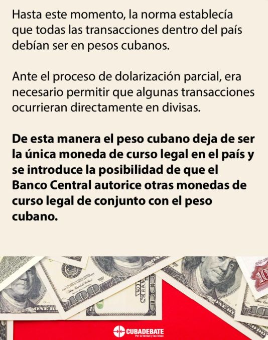 "Se trata de un proceso que no implica dolarizar la economía. Es importante entender que cuando me refiero a dolarizar no me refiero solo al dólar; es un término que usamos los economistas para indicar que coexisten la moneda nacional y otras divisas en la economía, autorizadas por el Banco Central. Hablamos de dolarización parcial porque la norma establece el alcance y la profundidad del proceso. No todas las transacciones pueden ser en divisas, y cuando nos referimos a la profundidad es que no todos los actores de la economía tienen que operar en divisas".
