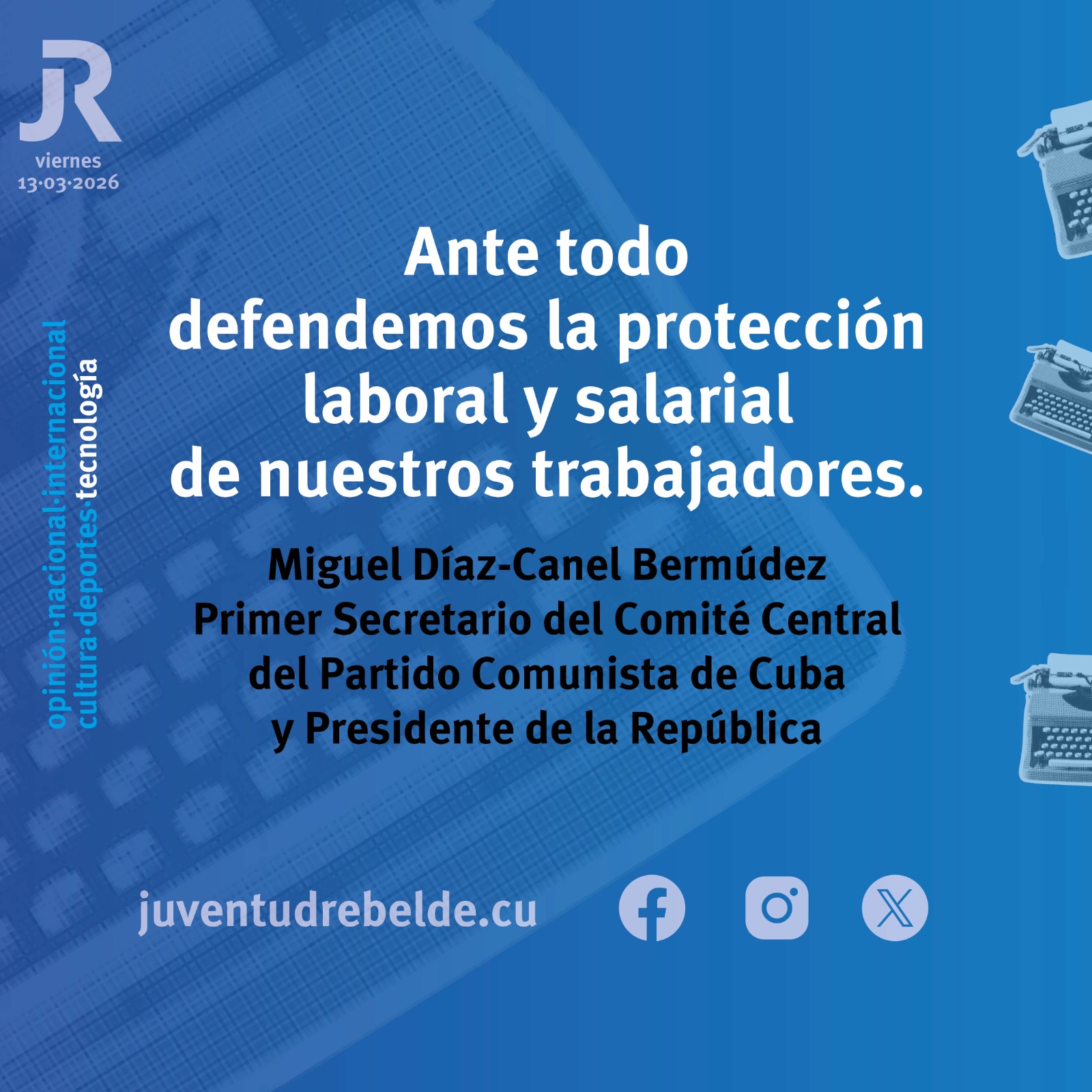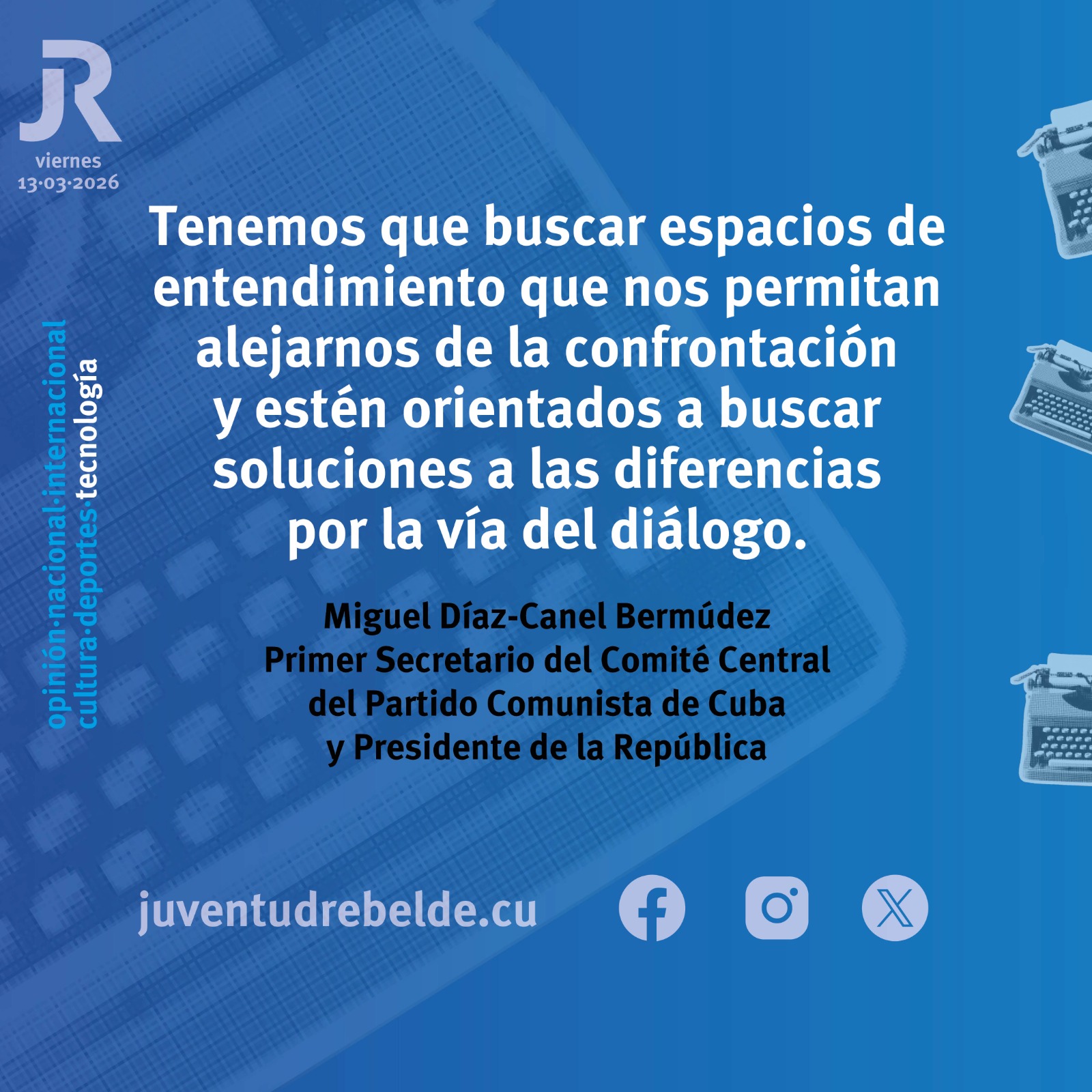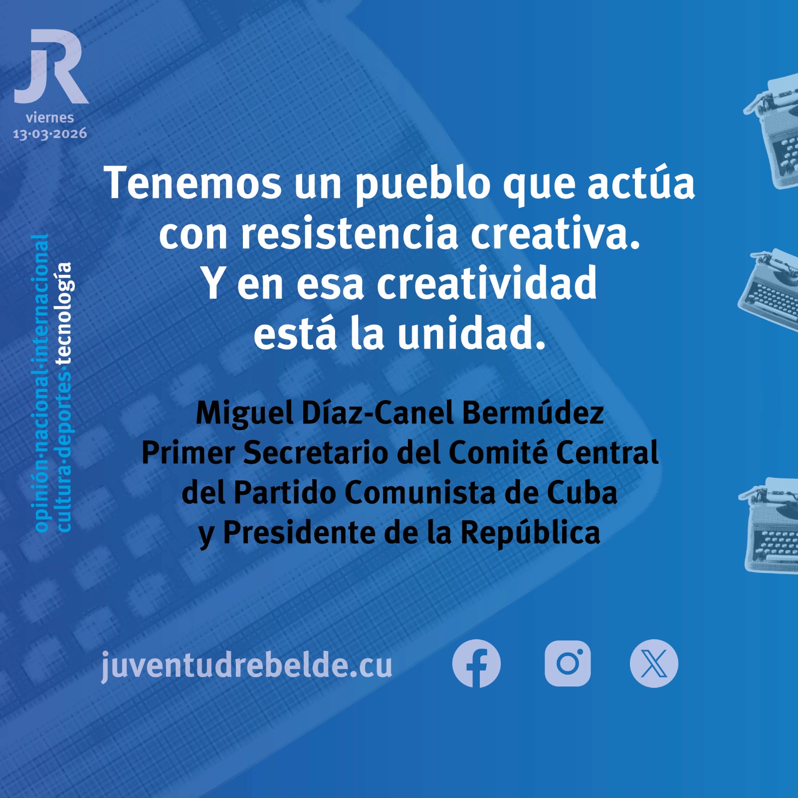 El Primer Secretario del Comité Central del Partido Comunista y Presidente de la República, Miguel Díaz-Canel Bermúdez, compareció ante los medios este viernes 13 de marzo de 2026 para abordar asuntos del acontecer nacional e internacional.