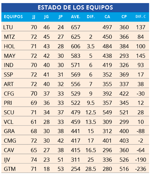 CI: Lázaro Cedeño (HOL) 71, Eduardo Blanco (MTZ) 69, Harold Vázquez (SCU) 67.