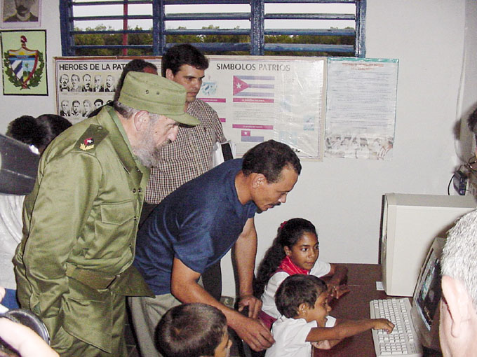 Hasta las lejanas aulas del centro Enma Rosa Chuy llegó Fidel para inaugurar el programa de la enseñanza de computación en escuelas primarias. Foto: Luis Carlos Palacios