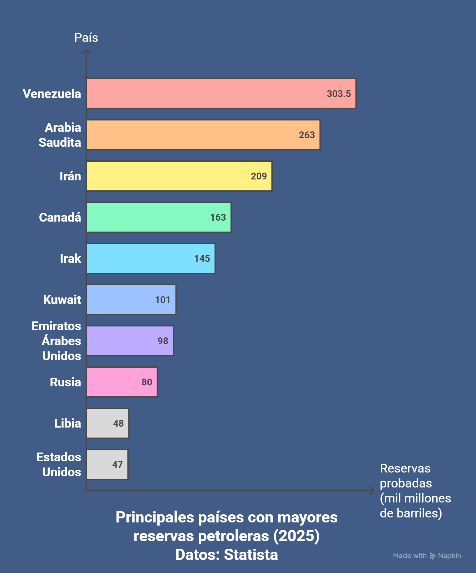 - Venezuela posee las mayores reservas probadas de petróleo del mundo, con más de 303 mil millones de barriles, superando a Arabia Saudita y Rusia, según datos de la Organización de Países Exportadores de Petróleo (OPEP).