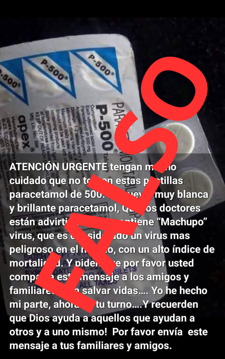 También ha circulado, sobre todo en WhatsApp, una imagen con un paracetamol que estaría contaminado con el Machupo, un virus letal. Sin embargo, un simple rastreo de la información revela que esta noticia falsa camina por las redes desde hace años, y se puede encontrar un desmentido al respecto del ministerio de Salud panameño en el año 2017. Este bulo del paracetamol con Machupo también se extendió por Ecuador y Argentina en años recientes.