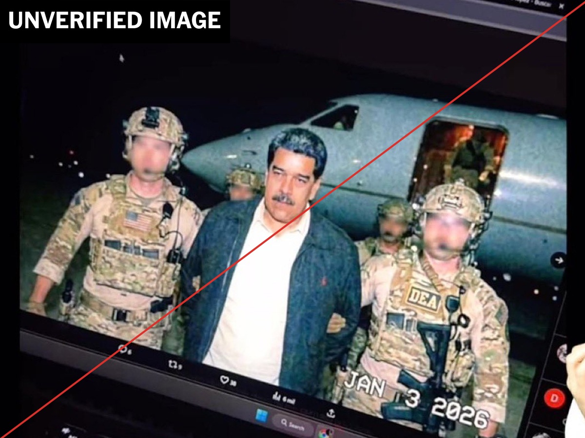 El 3 de enero último la primera imagen del secuestrado presidente Nicolás Maduro Moros era toda pompa al mejor estilo hollywoodense. El mandatario bolivariano, vestido de traje, aparecía custodiado por efectivos del ejército de Estados Unidos. Al fondo, un helicóptero. La foto tenía, además, la fecha en cuestión, en idioma inglés. Pero era falsa. Se trató de una superposición a partir de la captura, hace unos años, de un capo narcotraficante mexicano.