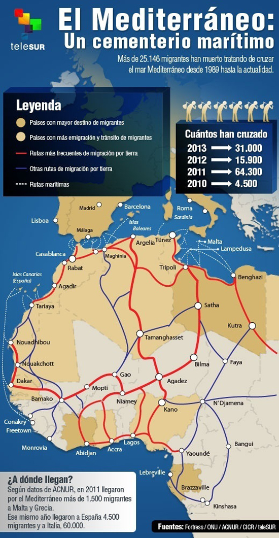 El mar Mediterráneo es una de las principales rutas hacia la Unión Europea (UE) para miles de personas, en su mayoría de origen asiático y africano, que huyen de la guerra y la pobreza. Crépeau, quien presentó un informe sobre los flujos migratorios en el Mediterráneo, alertó que si Europa insiste en destinar la mayoría de sus recursos a la seguridad, fracasará en su intento de derrotar a los contrabandistas, cuyo modelo de negocio se basa en aprovechar las barreras a la movilidad.