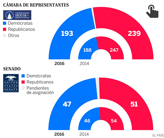 Además de la conquista de la Casa Blanca, los republicanos mantuvieron el control de las dos cámaras del Congreso (Cámara de Representantes y Senado), lo que garantiza a Trump una administración sin mayores tropiezos ni la necesidad de negociar constantemente con el Partido Demócrata, a la inversa de lo que ha caracterizado los años de la administración Obama.