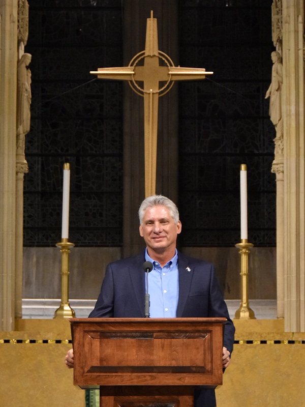 NUEVA YORK.— La noche de este miércoles en la Iglesia Riverside fue mágica. Su recinto hecho de encajes góticos, al filo de las nueve de la noche, estaba repleto de feligreses, de amigos de la Revolución cubana, de reporteros ávidos. Se esperaba la presencia del Presidente de los Consejos de Estado y de Ministros de la República de Cuba, Miguel Díaz-Canel Bermúdez.