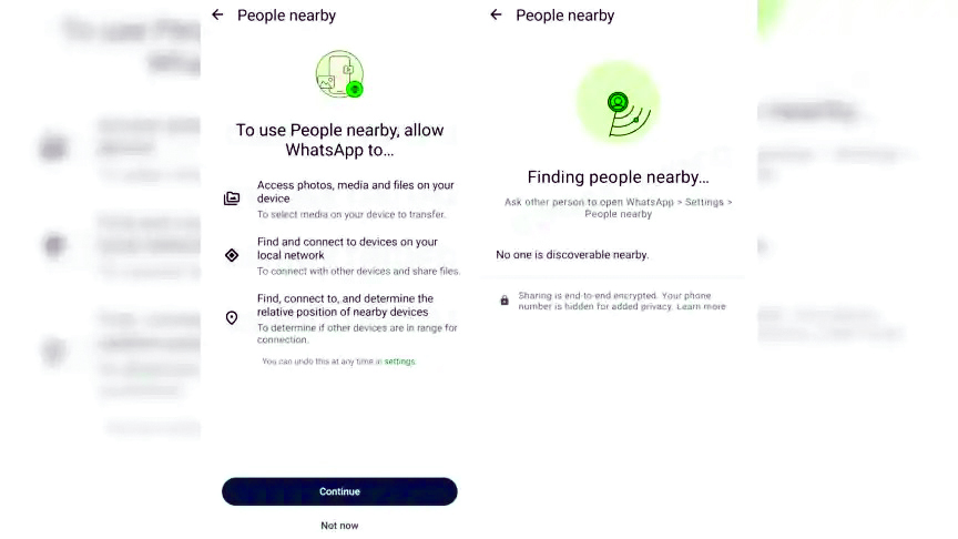 De acuerdo con WABetaInfo, la función se encuentra disponible en la versión 2.24.9.22, disponible en Google Play Store para usuarios beta de WhatsApp. Con People Nearby se pueden enviar archivos de cualquier tipo, incluyendo fotos, videos y documentos, directamente a otros dispositivos móviles cercanos.