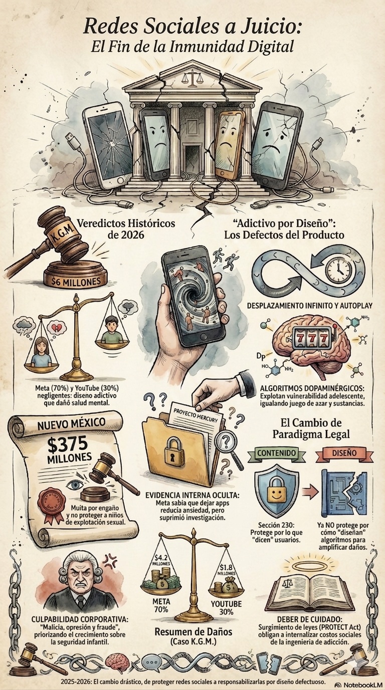 De acuerdo con el blog especializado en leyes de la Universidad de Cincinnati, en Estados Unidos, este cambio de paradigma permite que las aplicaciones sean juzgadas con los mismos estándares que un vehículo con frenos defectuosos. Al tratar el diseño algorítmico como una conducta procesable y no como un discurso protegido, los tribunales responden a la evolución tecnológica y buscan que las corporaciones no utilicen leyes obsoletas para evadir su responsabilidad por prácticas que dañan el desarrollo cerebral de niños y adolescentes.