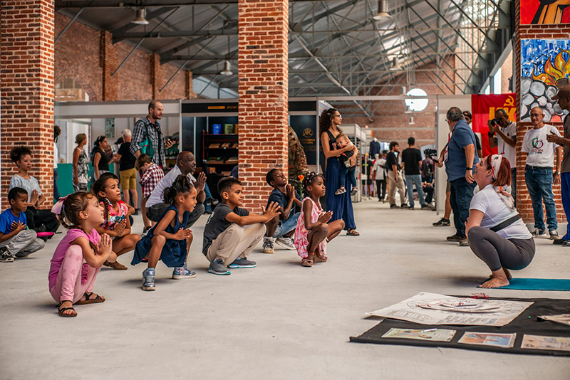 Expresar afectos a través del cuerpo, una enseñanza que la instructora Judith, de El Arte de Vivir, compartió con chicos participantes en la festividad. Foto: Adrián Fonseca.